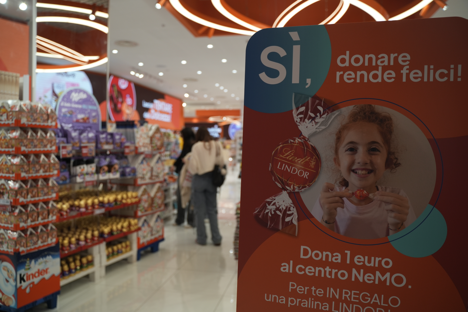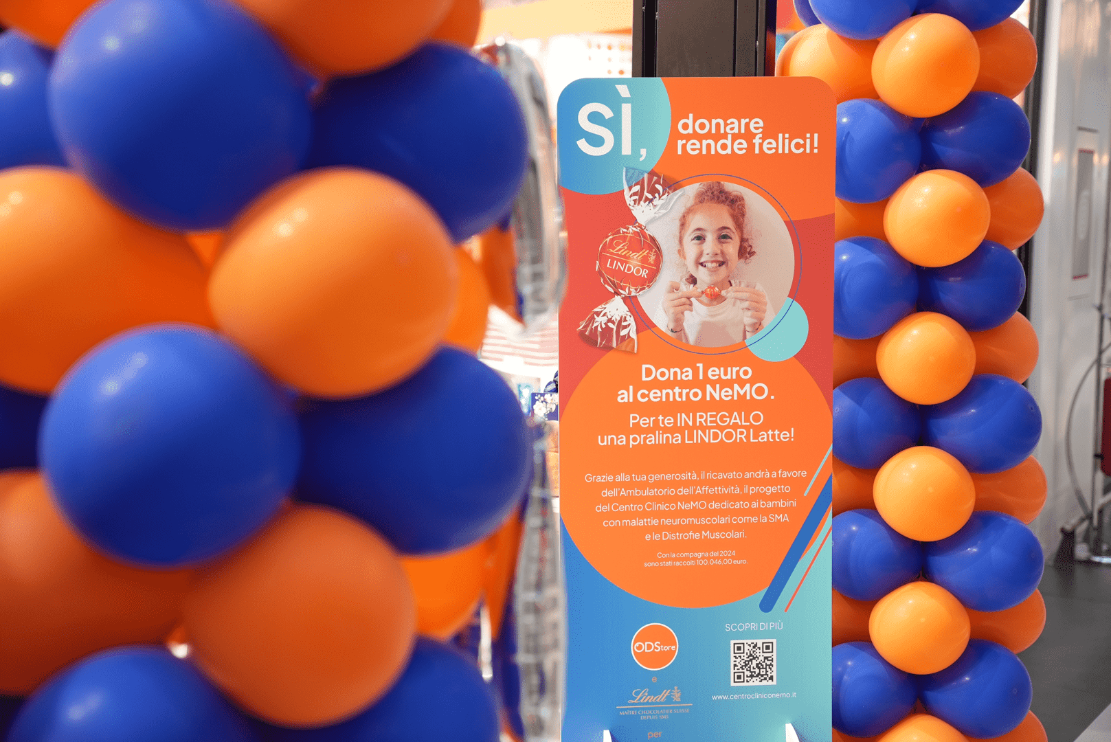 Fino all’8 dicembre, in tutti i 130 punti vendita ODStore d’Italia, sarà possibile donare 1 euro in cassa e ricevere una pralina Lindor al latte come segno di ringraziamento. Ogni cioccolatino significa un gesto concreto di sostegno dell’Ambulatorio dell’Affettività dei Centri NeMO, un progetto che si prende cura dei bambini e dei ragazzi con SMA, Distrofie Muscolari e altre patologie neuromuscolari, accompagnandoli insieme ai loro genitori nell’affrontare il percorso di malattia e di crescita, di educazione e di relazione con gli altri.